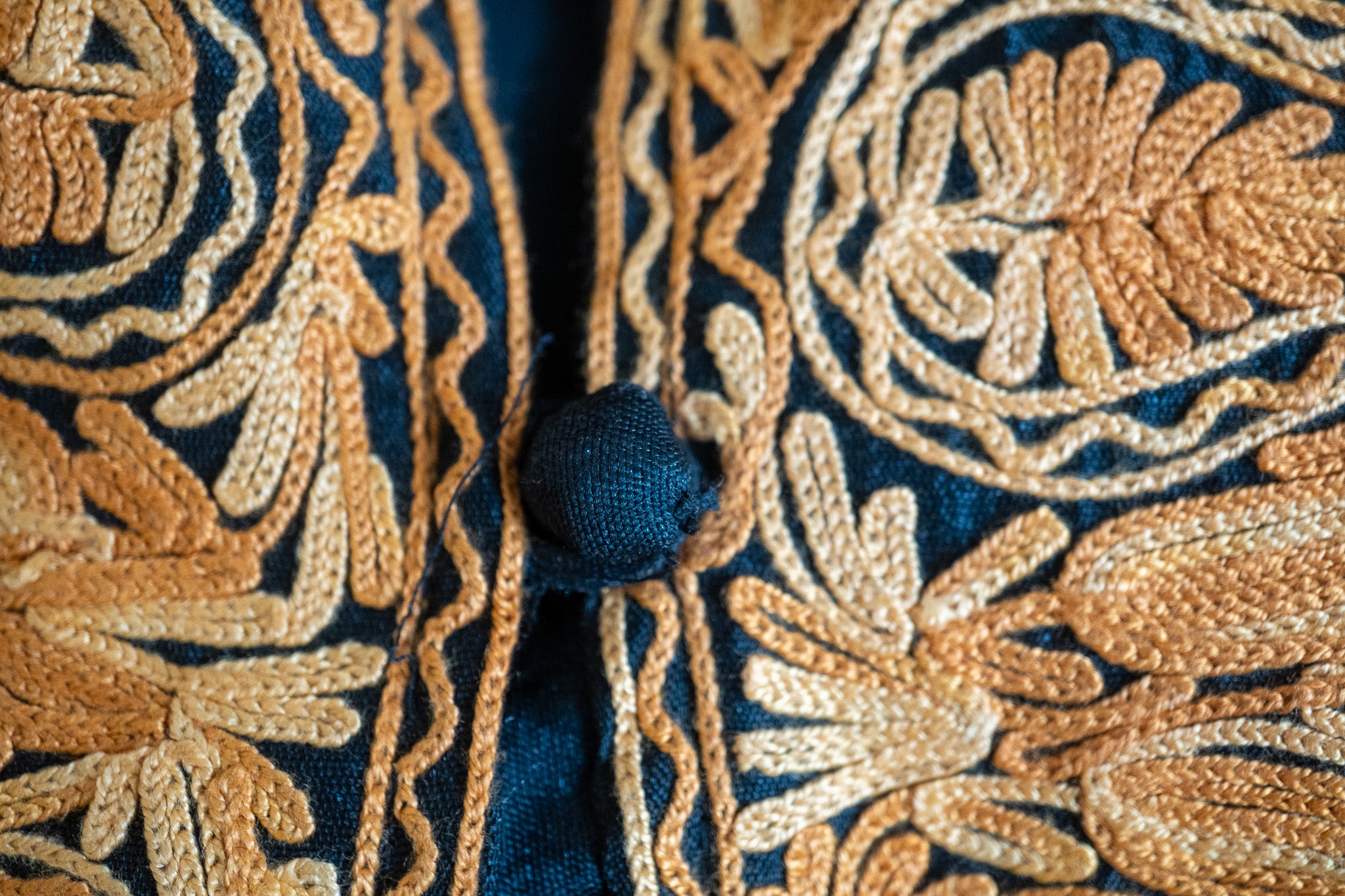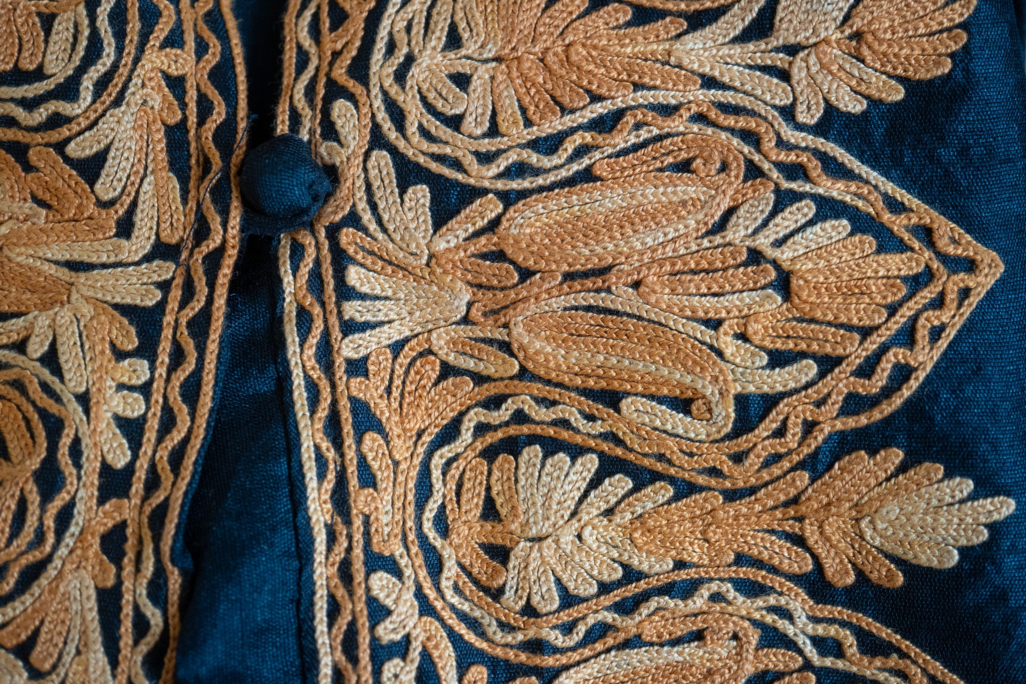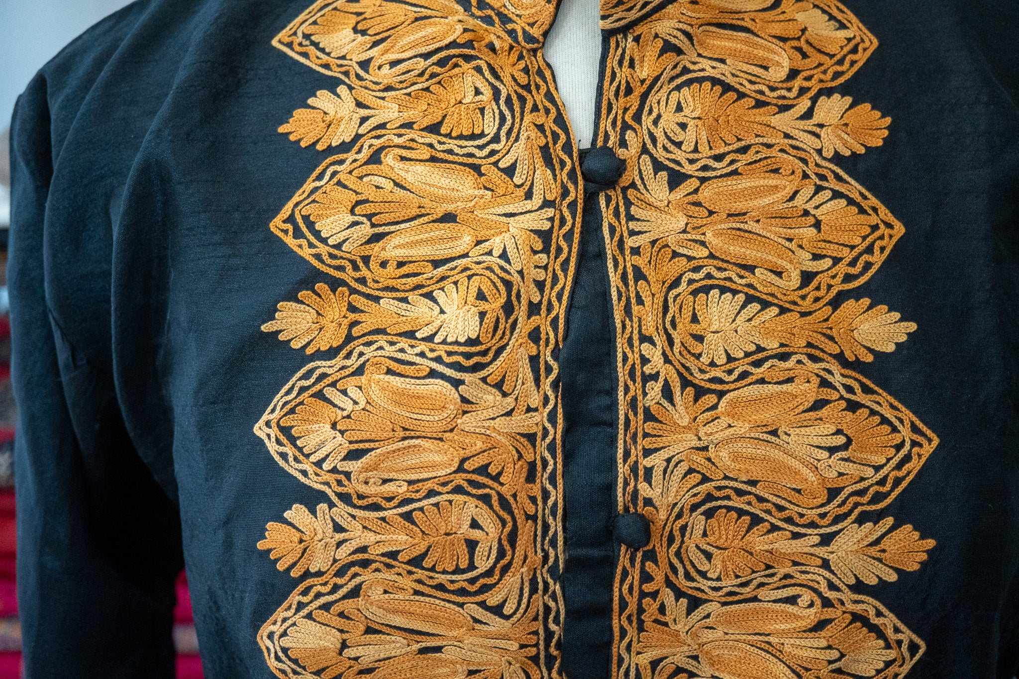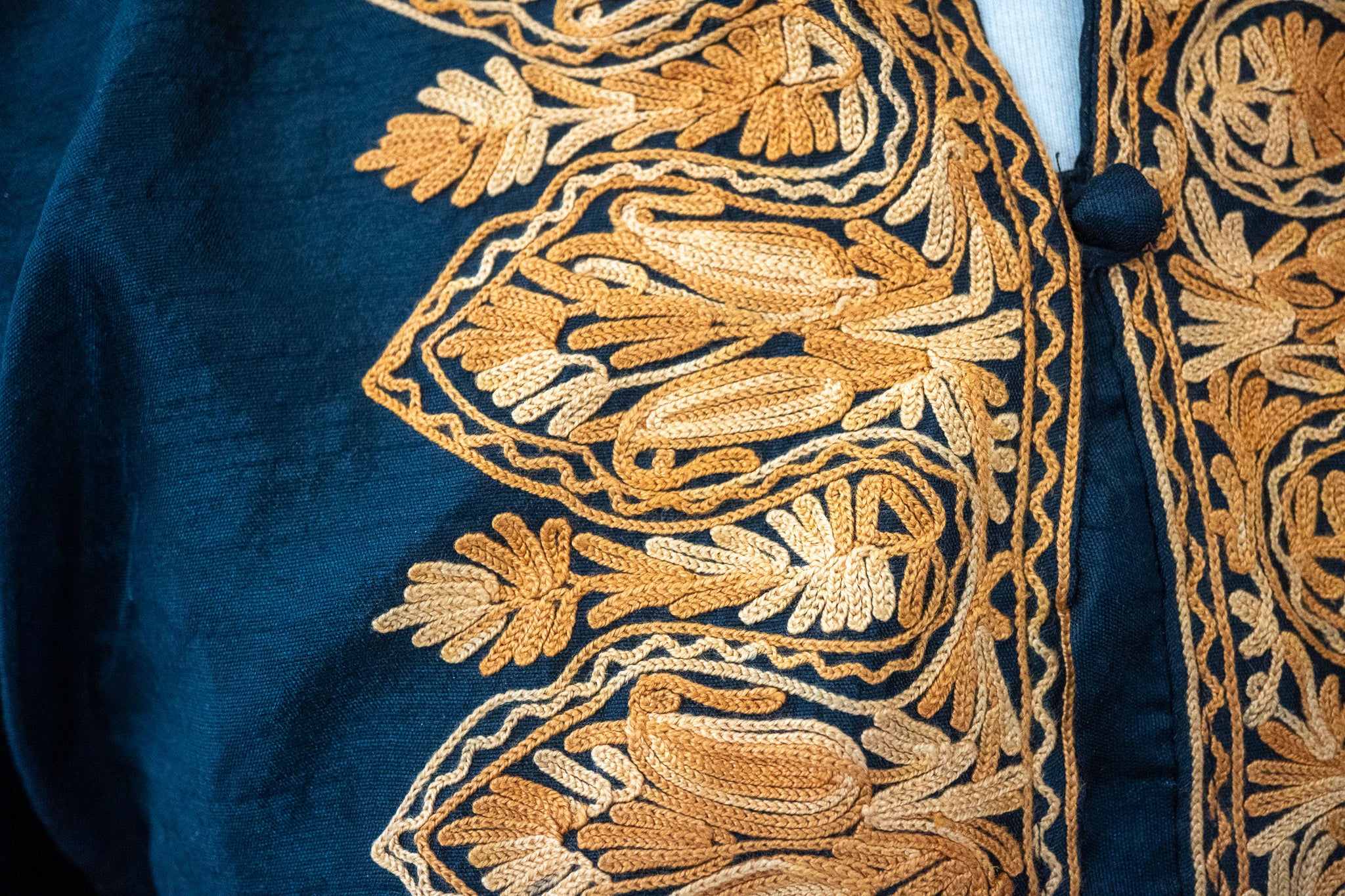 Cette veste en soie est entièrement confectionnée au Cachemire selon la technique traditionnelle du Aari, un savoir-faire ancestral autrefois réservé aux cours royales mogholes. Chaque motif floral est brodé avec une précision exceptionnelle, demandant de travail à des artisans spécialisés. Ces vestes trouvent leur origine dans l’histoire des habits de cour du Cachemire, symboles de raffinement et d’élégance culturelle. Légère et luxueuse, cette pièce unique allie héritage artisanal et style contemporain. Une véritable œuvre d’art à porter.