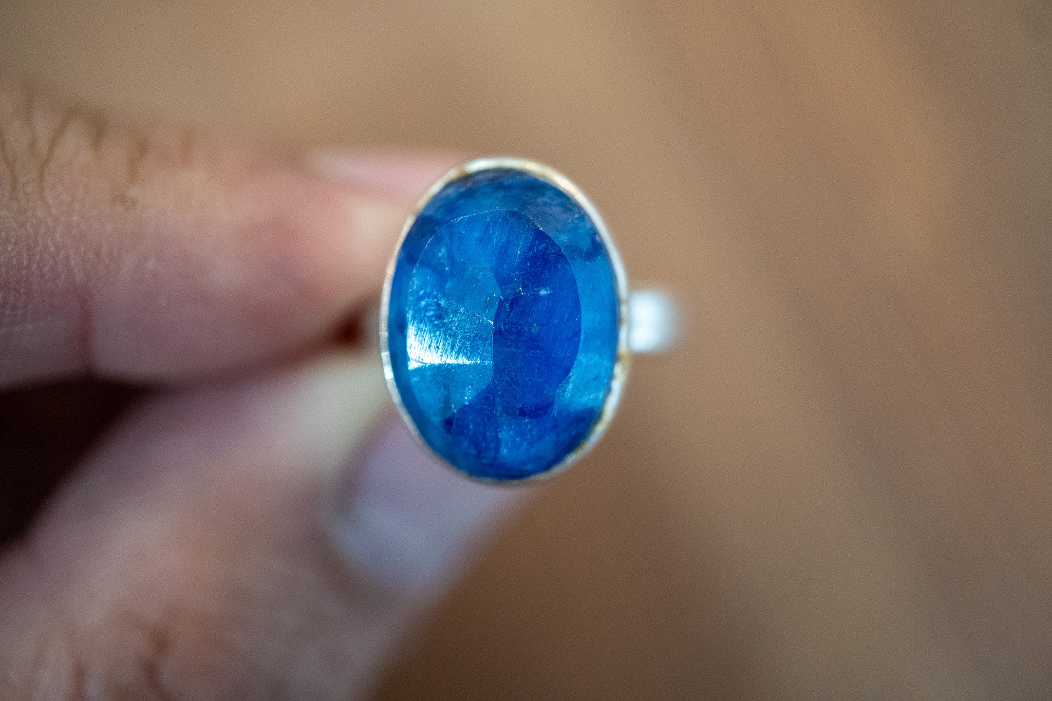 Bague ornée d’un saphir naturel de forme ovale (16×12 mm), serti clos sur argent 925 massif. La pierre révèle un bleu profond et vibrant, avec des inclusions naturelles caractéristiques des gemmes authentiques non traitées. La monture épurée met en valeur la présence de la pierre sans excès ornemental, offrant une élégance à la fois forte et discrète.