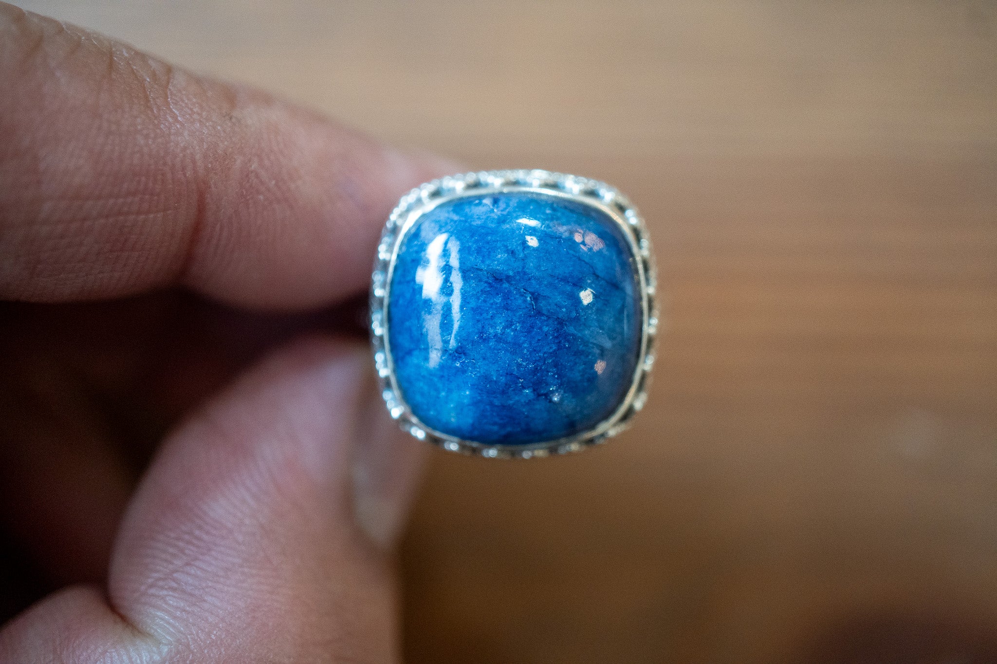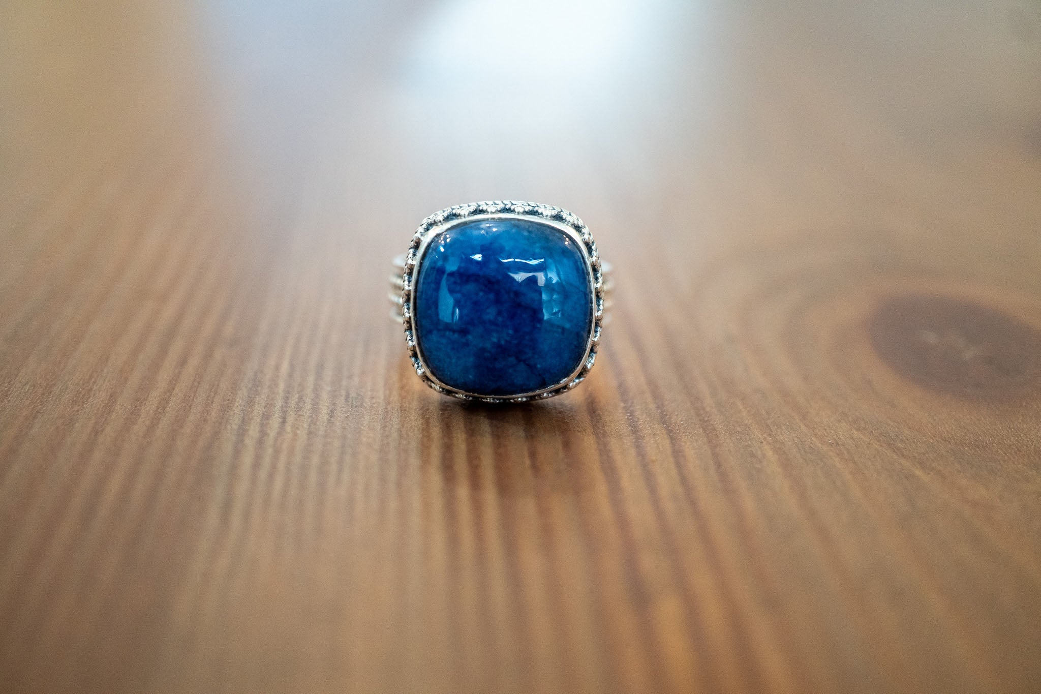 Bague artisanale sertie d’un saphir naturel cabochon de 18 mm, monté sur une structure en argent 925 au travail décoratif détaillé. La pierre, au bleu profond et vivant, révèle des nuances naturelles caractéristiques des gemmes authentiques non traitées. Le design expressif et texturé de la monture évoque un savoir-faire traditionnel, tout en conservant une élégance intemporelle. Une pièce de caractère, confortable à porter, pensée comme un bijou signature unique.