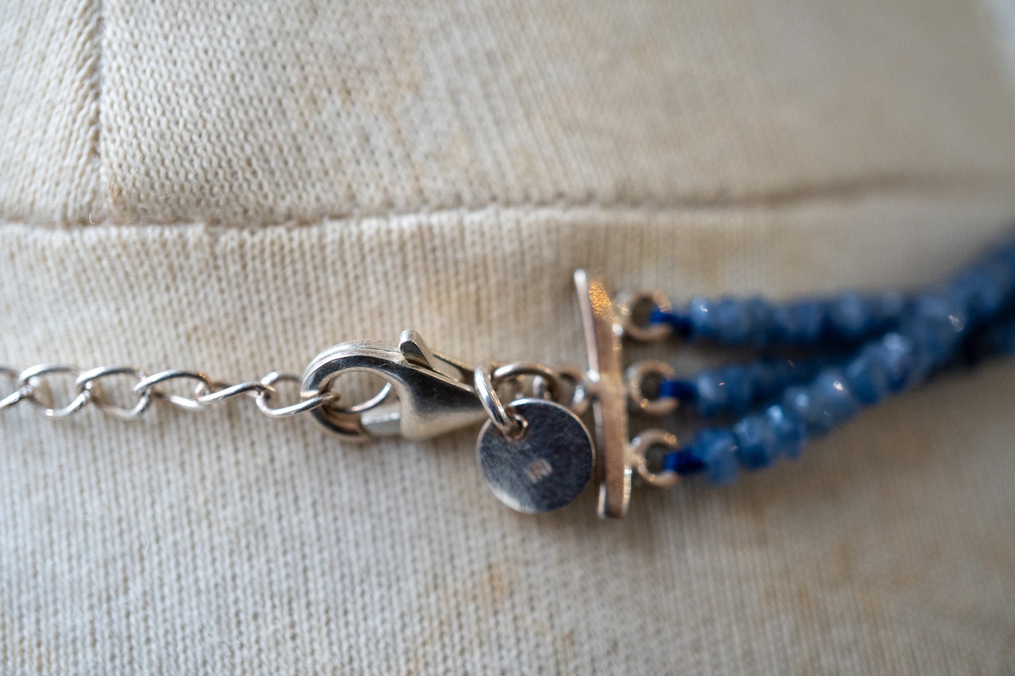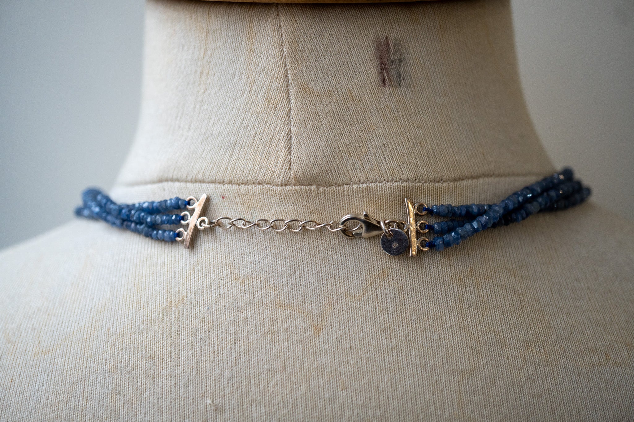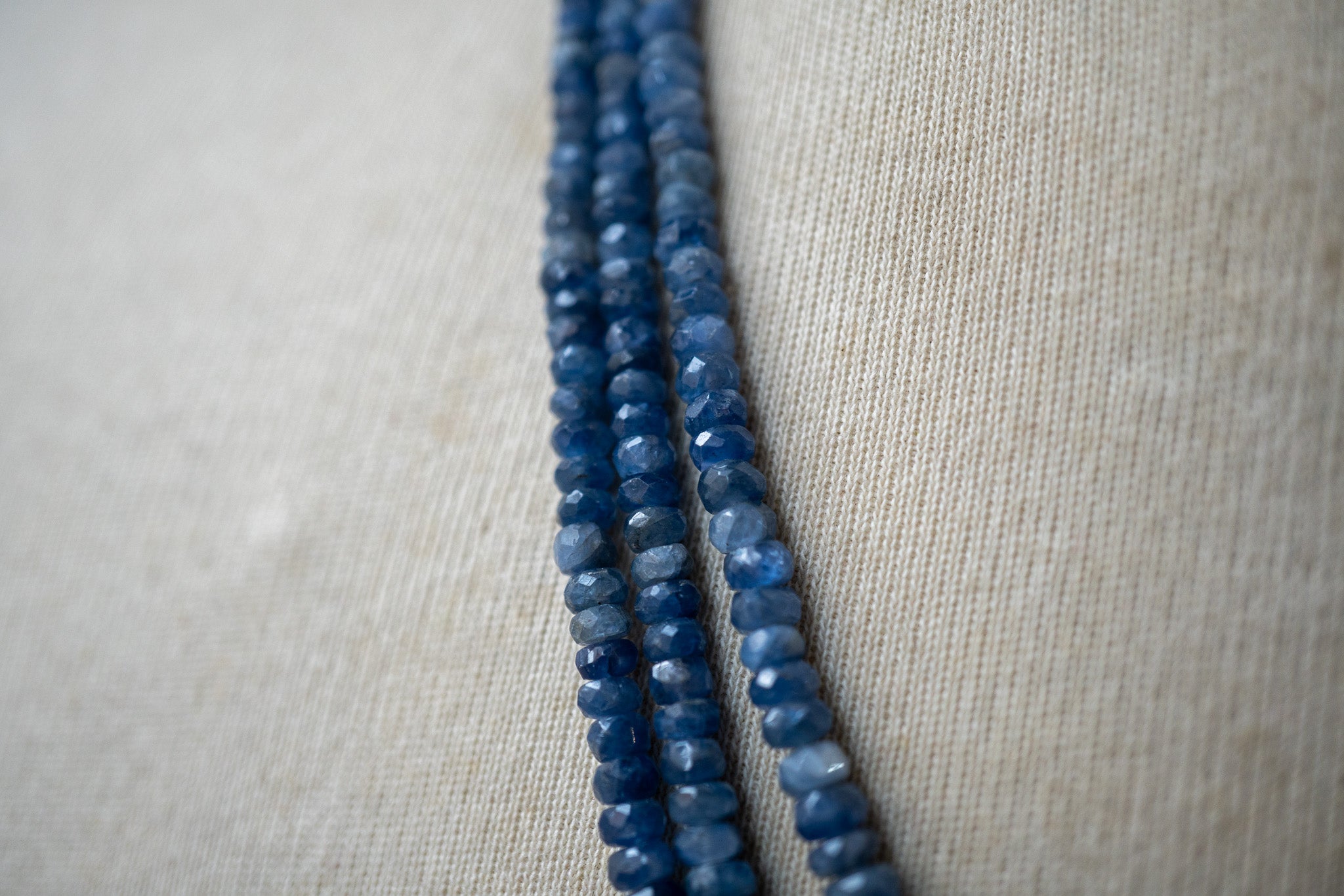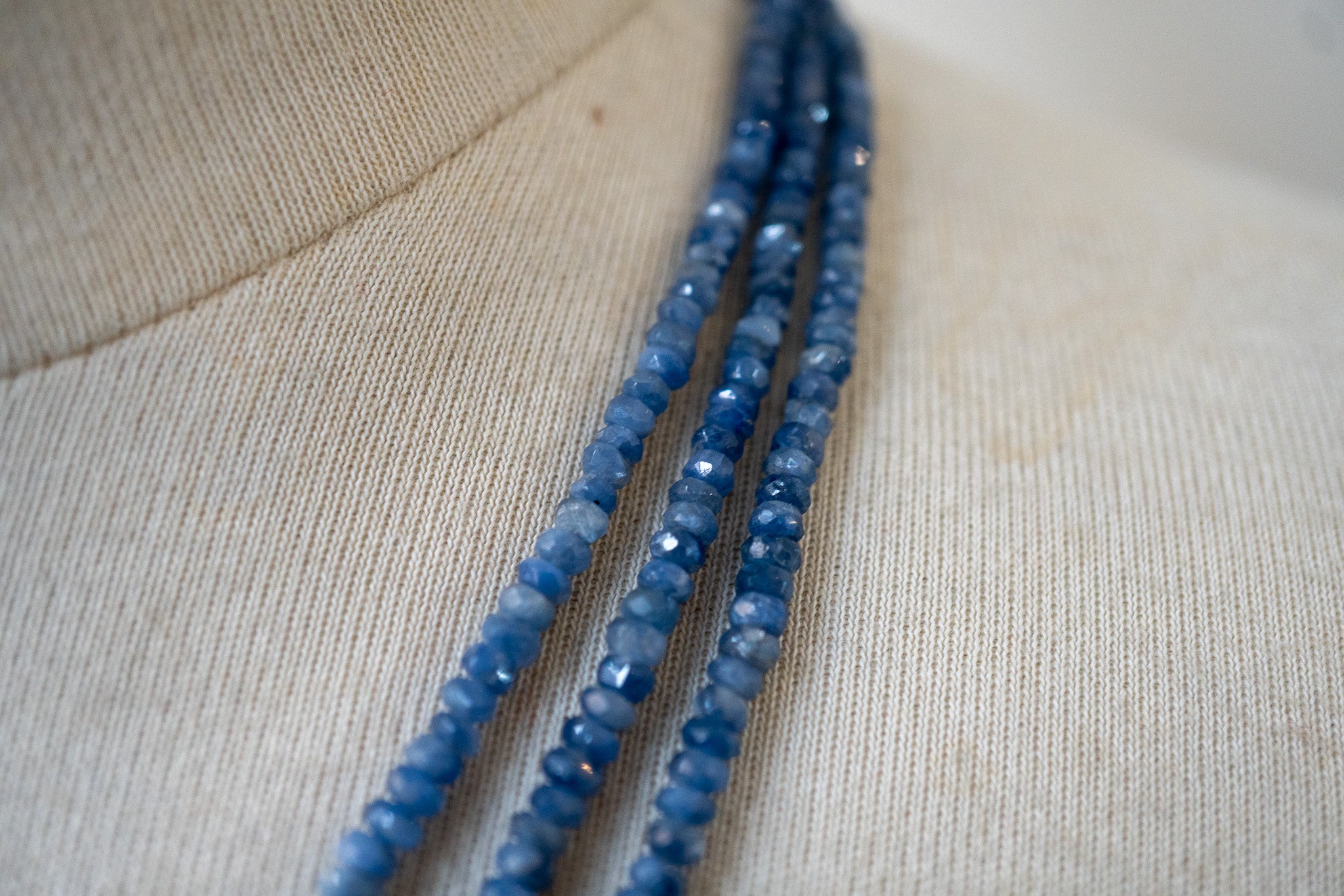 Collier composé de trois rangs de saphirs naturels facettés, sélectionnés pour leurs nuances authentiques de bleu profond. Chaque pierre, taillée à la main (environ 3.5 à 4 mm), capte la lumière avec un éclat subtil et naturel, sans brillance excessive. Monté sur argent 925, ce collier offre une présence élégante tout en restant léger et confortable à porter.
