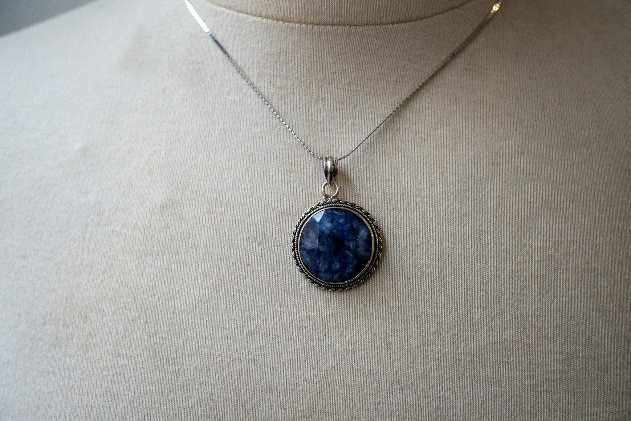 Pendentif ethnique rond en saphir naturel et argent 925 (grand)