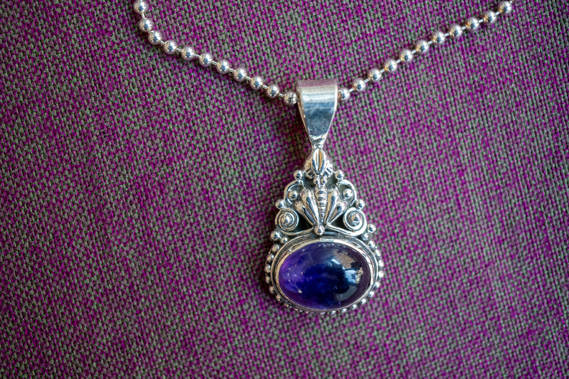 Ein eleganter Anhänger, inspiriert von indischer Kunst und besetzt mit einem natürlichen Amethyst. Sein raffiniertes Design und seine tiefe Brillanz machen ihn zu einem zeitlosen Schmuckstück, das Ihrem Outfit einen Hauch von Geheimnis und Eleganz verleiht.