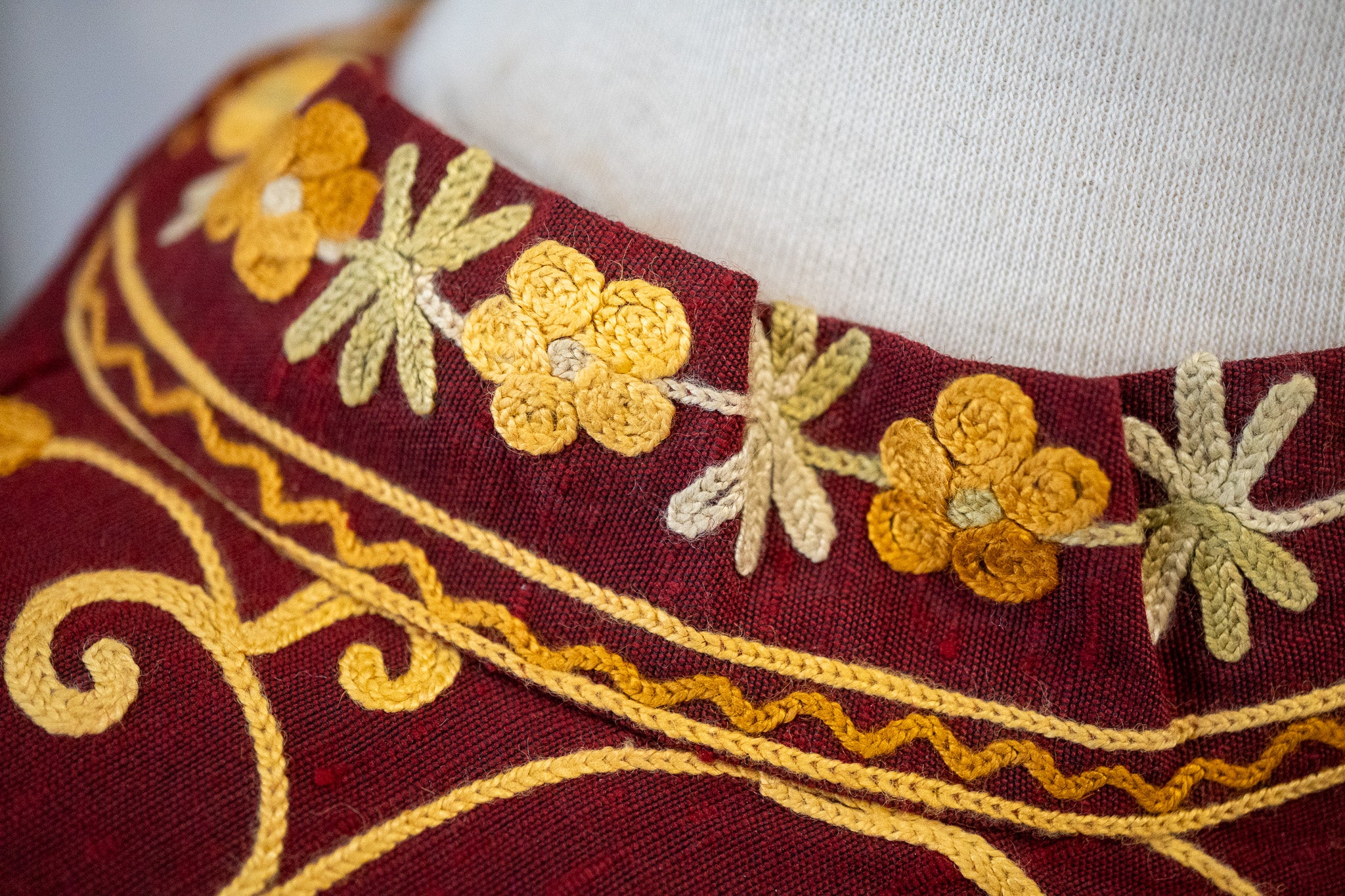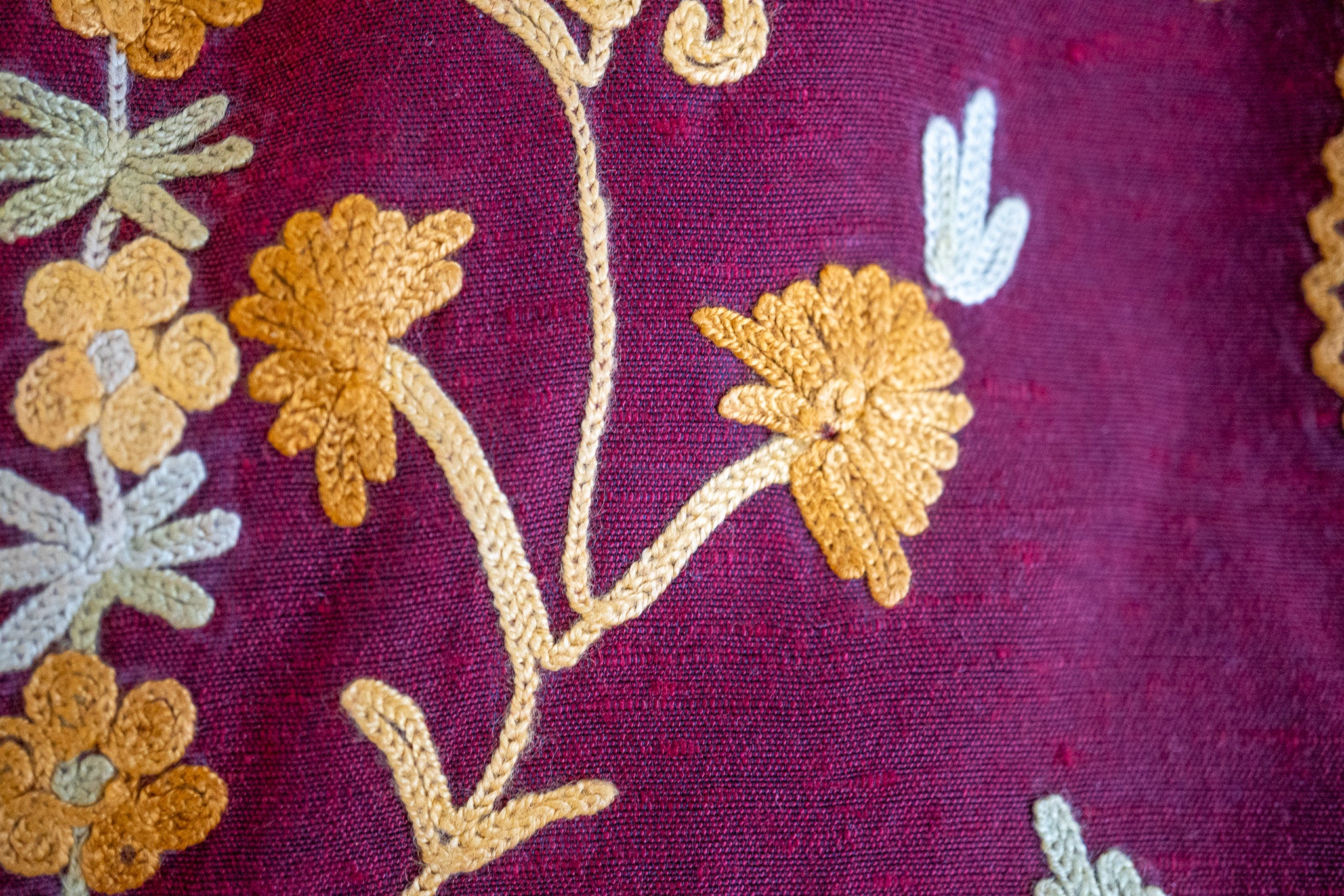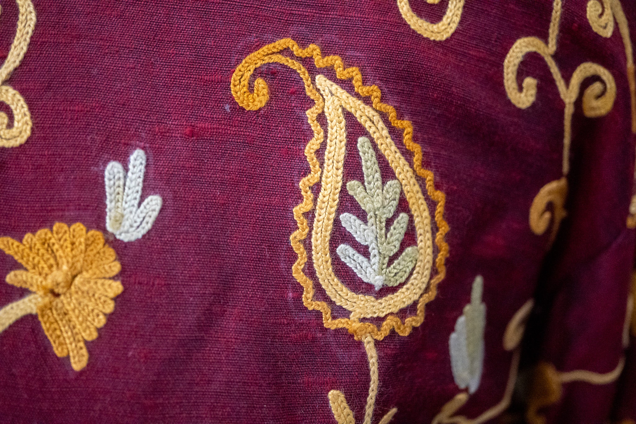 Diese Seidenjacke wird vollständig in Kaschmir nach der traditionellen Aari- Technik gefertigt, einem uralten Handwerk, das einst den Mogulhöfen vorbehalten war. Jedes Blumenmuster ist mit außergewöhnlicher Präzision bestickt und erfordert die Arbeit spezialisierter Handwerker. Diese Jacken haben ihren Ursprung in der Geschichte der höfischen Kleidung Kaschmirs, Symbole für Raffinesse und kulturelle Eleganz. Leicht und luxuriös, vereint dieses einzigartige Stück handwerkliches Erbe und modernen Stil. Ein wahres Kunstwerk zum Tragen.