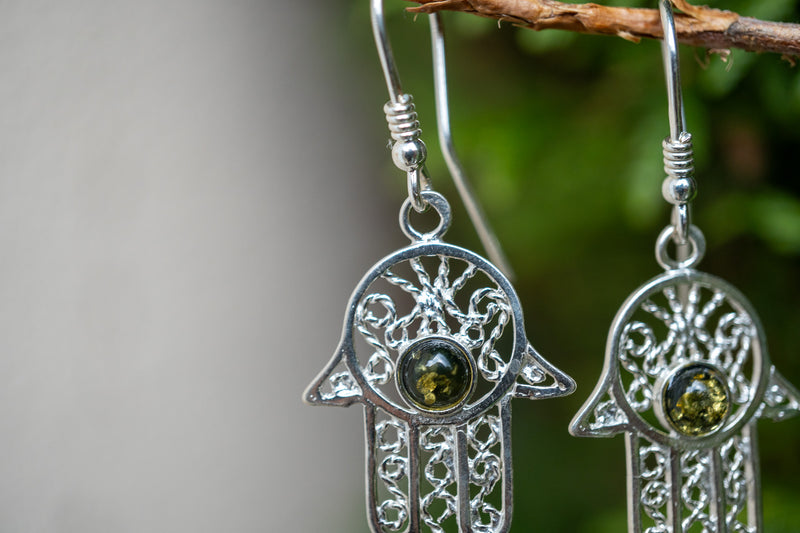 These 925 silver Hamsa hand earrings, adorned with sumptuous cognac Baltic amber, embody a perfect fusion of timeless elegance and ancient symbolism. Each earring is embellished with a deep green amber stone, catching the light with its shimmering reflections. This amber, mined from the depths of the Baltic Sea, is prized for its natural beauty and calming properties.