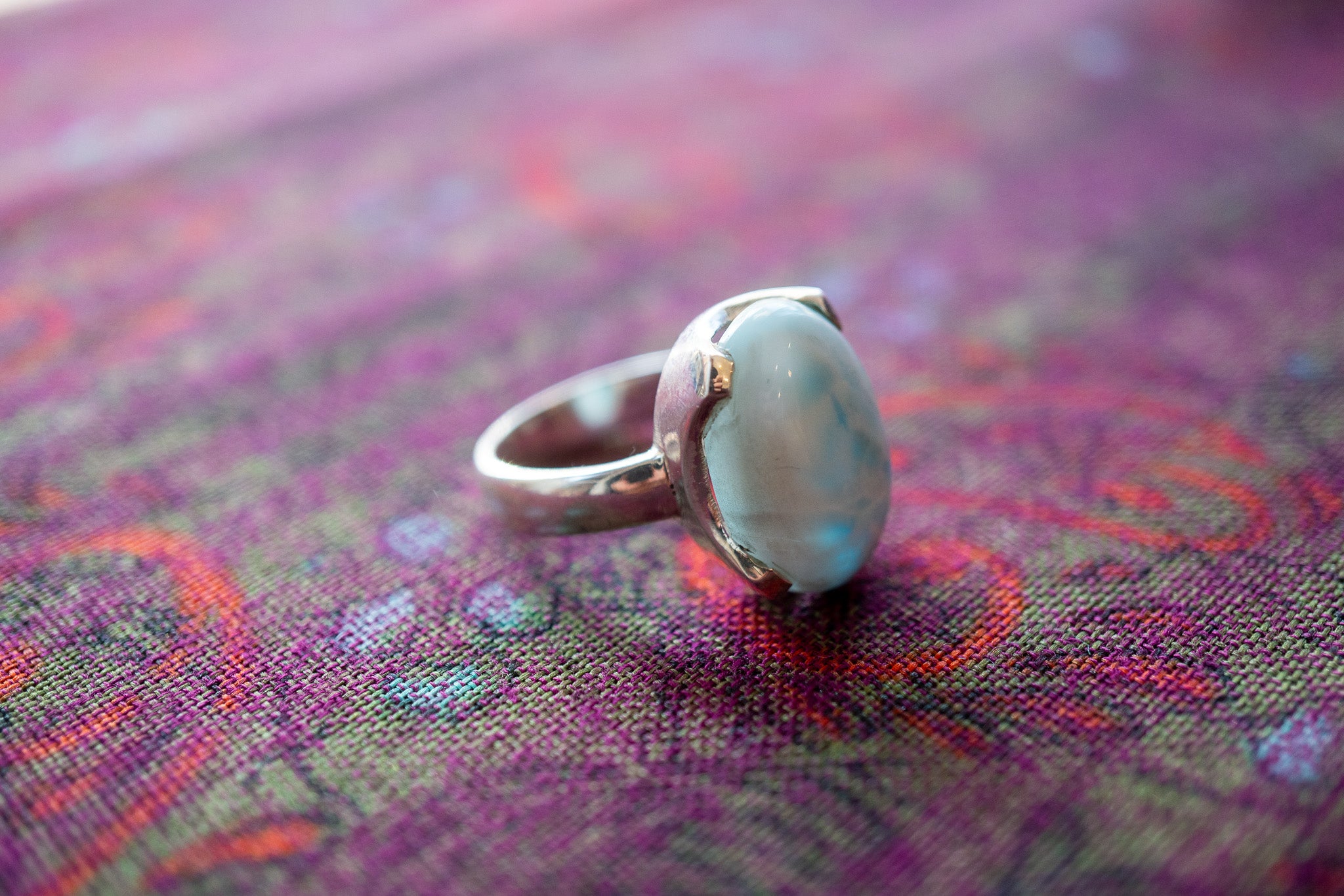 Discover the rare and soothing beauty of this 925 silver oval ring adorned with a natural larimar. Known for its unique light blue hue, reminiscent of the crystal-clear waters of the Caribbean, larimar is a gemstone prized for its elegance and serenity.
