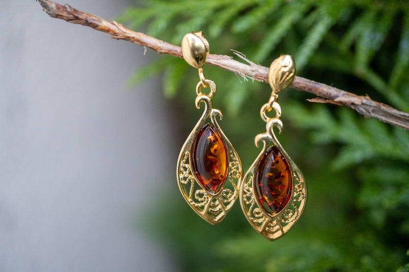 925 Silver Gold Plated Drop Earrings with Cognac Amber