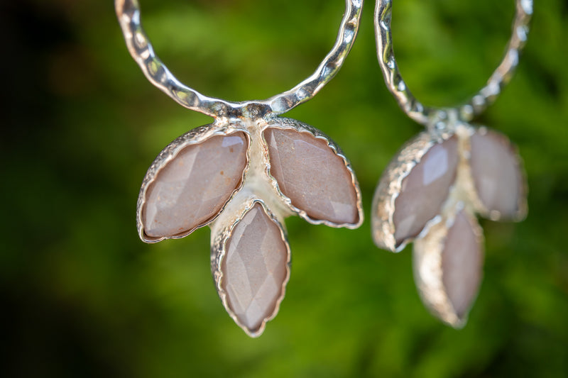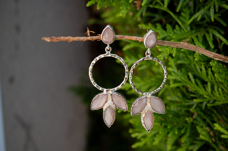 De longues boucles d'oreilles en argent avec des pierres de lune taillées en cabochon, qui capturent la lumière avec des reflets subtils, offrant un style délicat et poétique.