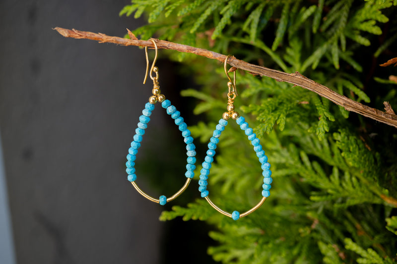 Boucles d'oreilles avec turquoise reconstituée, élégamment montées dans un métal précieux comme l'argent ou l'or. Les pierres de turquoise, aux teintes vibrantes et intenses, offrent une couleur riche et uniforme qui imite la beauté naturelle de la turquoise. Leur design moderne et raffiné ajoute une touche d'éclat et de fraîcheur, parfaites pour rehausser n'importe quelle tenue avec une note de sophistication et de couleur.