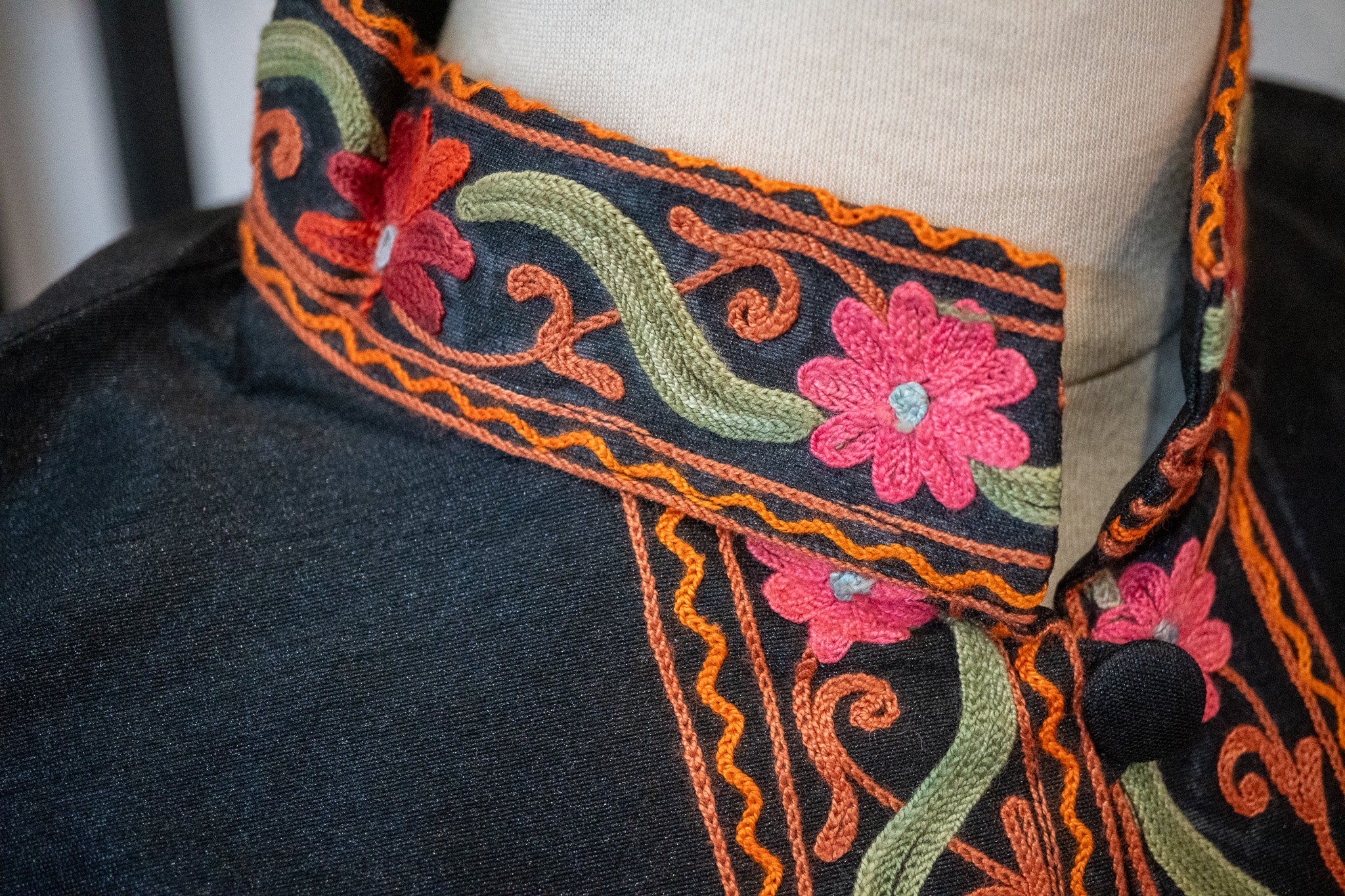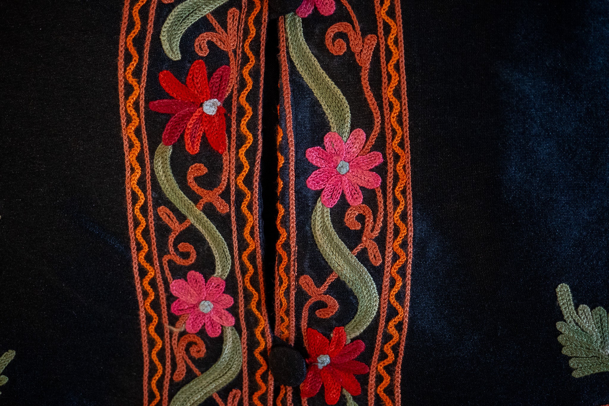Cette veste en soie est entièrement confectionnée au Cachemire selon la technique traditionnelle du Aari, un savoir-faire ancestral autrefois réservé aux cours royales mogholes. Chaque motif floral est brodé avec une précision exceptionnelle, demandant de travail à des artisans spécialisés. Ces vestes trouvent leur origine dans l’histoire des habits de cour du Cachemire, symboles de raffinement et d’élégance culturelle. Légère et luxueuse, cette pièce unique allie héritage artisanal et style contemporain. Une véritable œuvre d’art à porter.