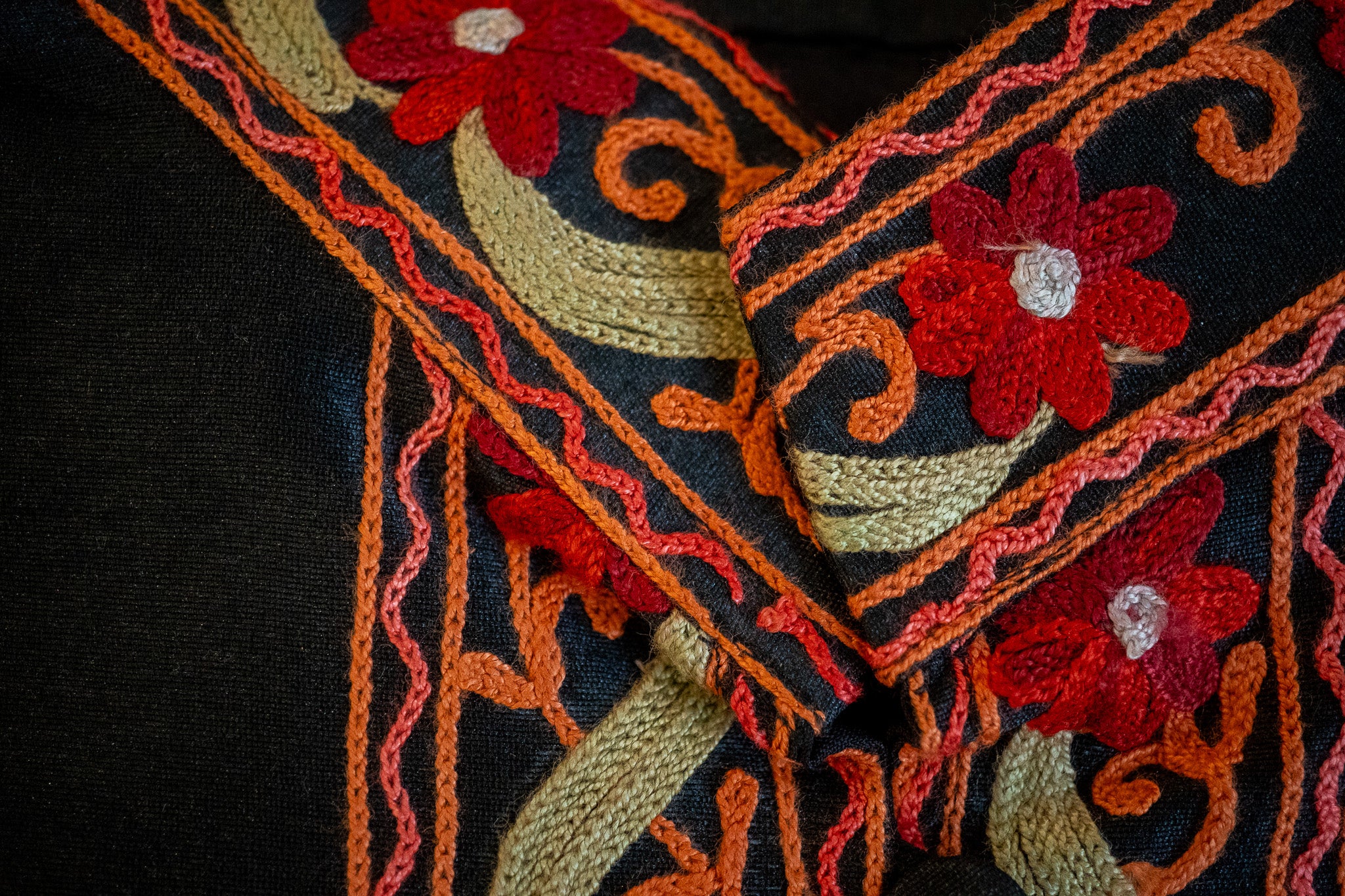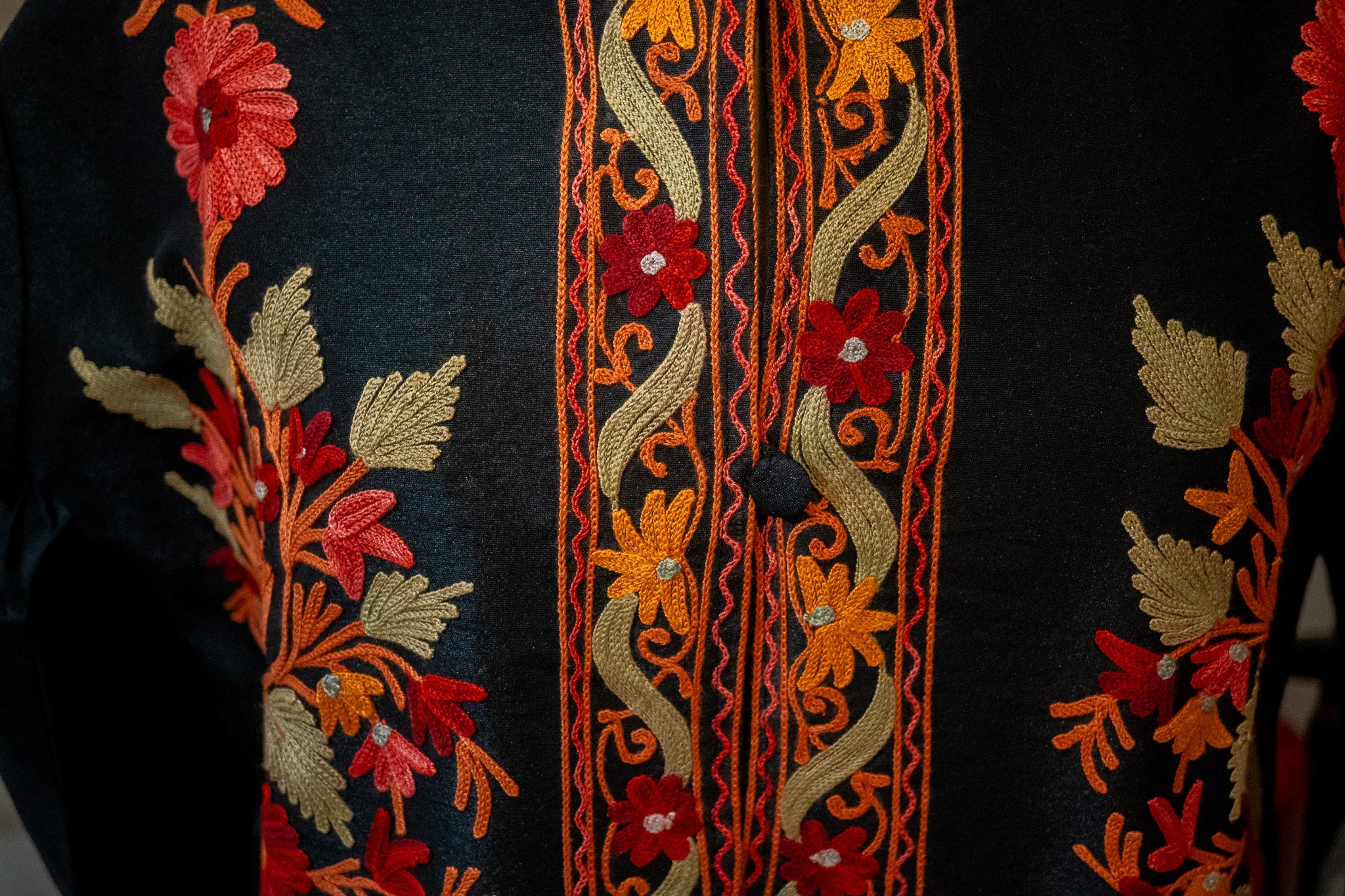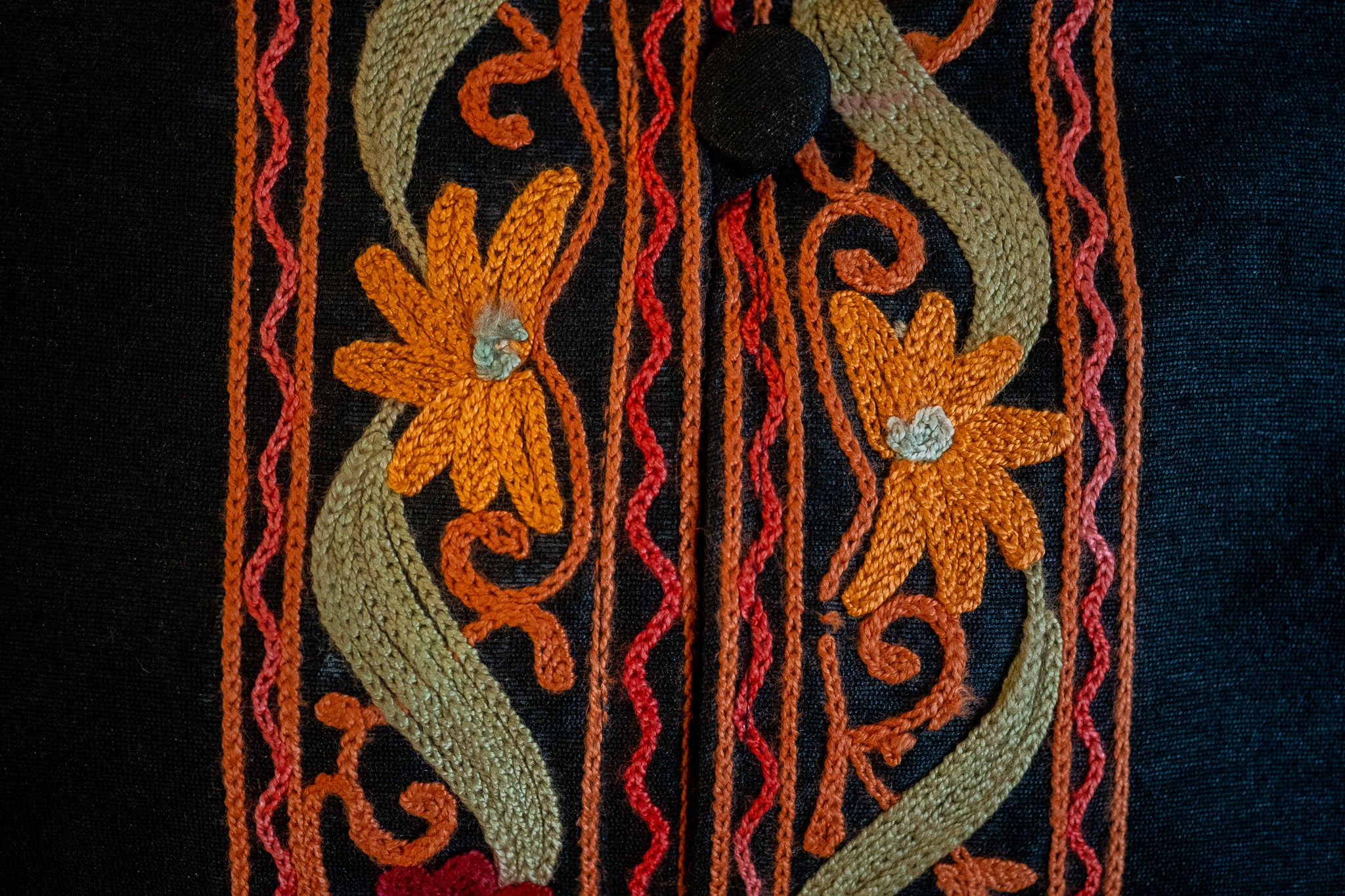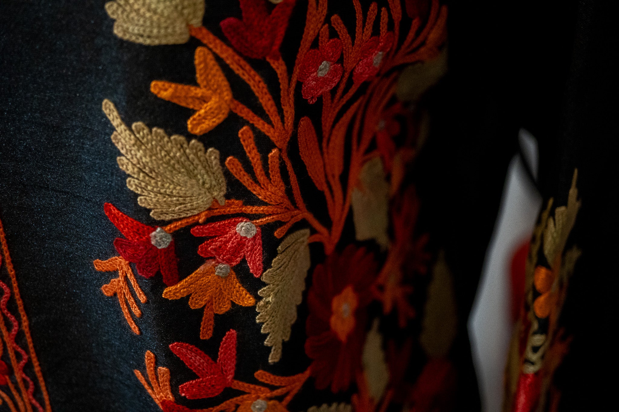 Cette veste en soie est entièrement confectionnée au Cachemire selon la technique traditionnelle du Aari, un savoir-faire ancestral autrefois réservé aux cours royales mogholes. Chaque motif floral est brodé avec une précision exceptionnelle, demandant de travail à des artisans spécialisés. Ces vestes trouvent leur origine dans l’histoire des habits de cour du Cachemire, symboles de raffinement et d’élégance culturelle. Légère et luxueuse, cette pièce unique allie héritage artisanal et style contemporain. Une véritable œuvre d’art à porter.
